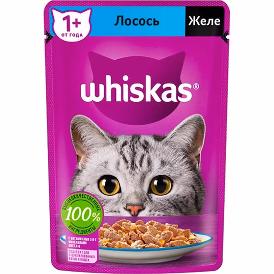 پوچ گربه بالغ ویسکاس ماهی سالمون در ژله 75 گرمی (روسی) | Whiskas salmon Jelly 75g